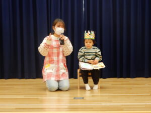 2025.12.19 お知らせ, ニュース, 園日記 12月の誕生会 今日は12月の誕生会。12月生まれの園児は1人だけです。たった1人で舞台の上は緊張していましたが、とってもいい笑顔でした。そのあと、先生たちの出し物があり園児たちは大喜びでした。