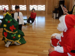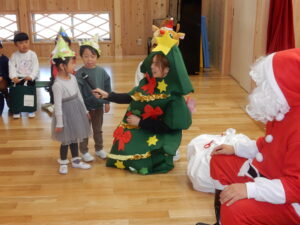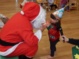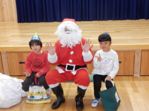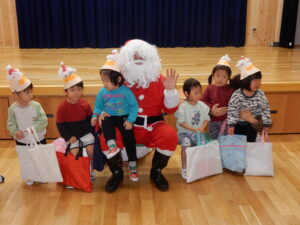 今日はクリスマス会。少し早いですが、幼稚園部の園児が冬休みに入る前に開催しました。今年のクリスマス会は先生2人によるダンスでスタート。サンタさんが登場し、1人ずつサンタさんからプレゼントをもらいました。そのあとクラスごとに記念撮影。最後にサンタさんに歌のプレゼントをしました。サンタさんが怖くて泣きながらプレゼントをもらった園児もいました。💦💦
