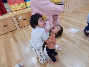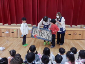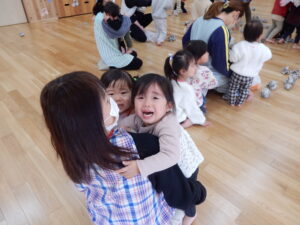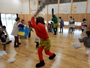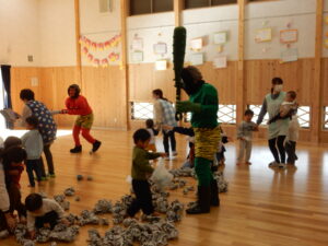 2026.02.03 お知らせ, ニュース, 園日記 節分の豆まき 今日は節分の豆まき。最初は先生が背中に背負った箱をめがけて新聞紙を丸めた「豆」をぶつけていましたが、突然青鬼(緑鬼?)と赤鬼が登場!会場は泣き声でいっぱいになりました。小さい園児はこわかっただろうな(笑)